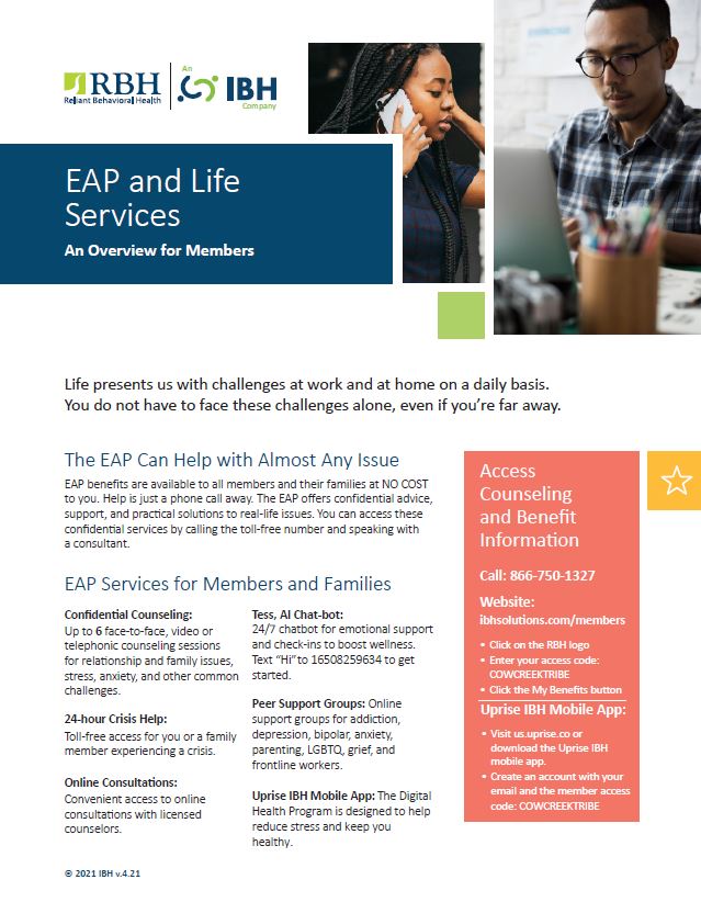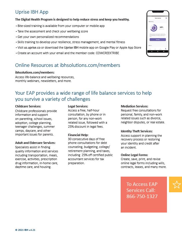 To begin to explore your EAP benefits, call 866-750-1327. Access code is “CowCreekTribe”