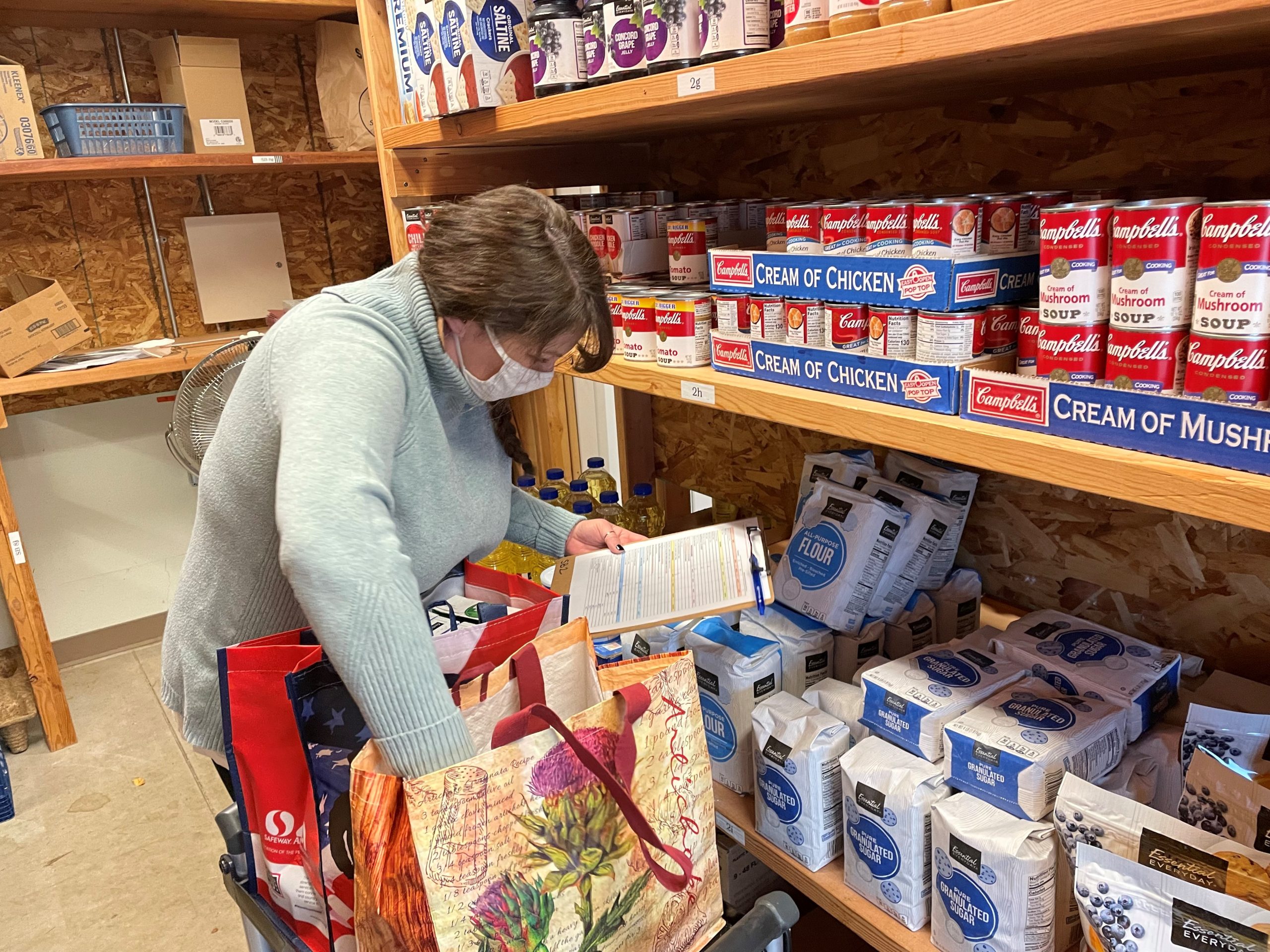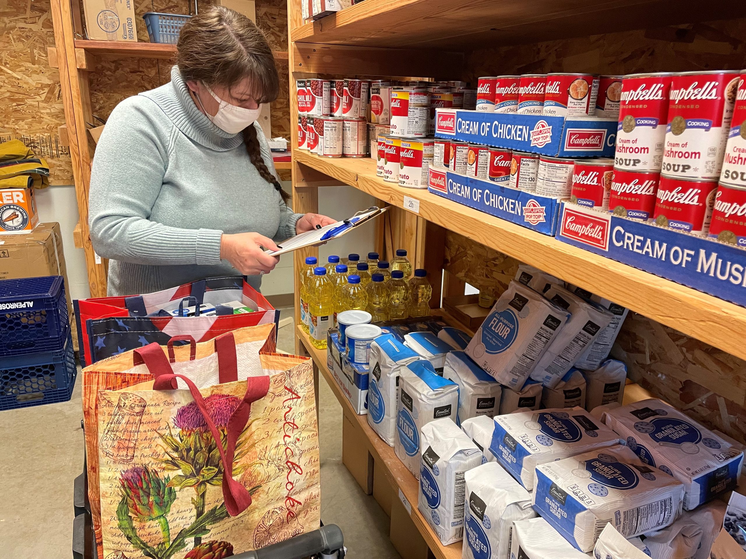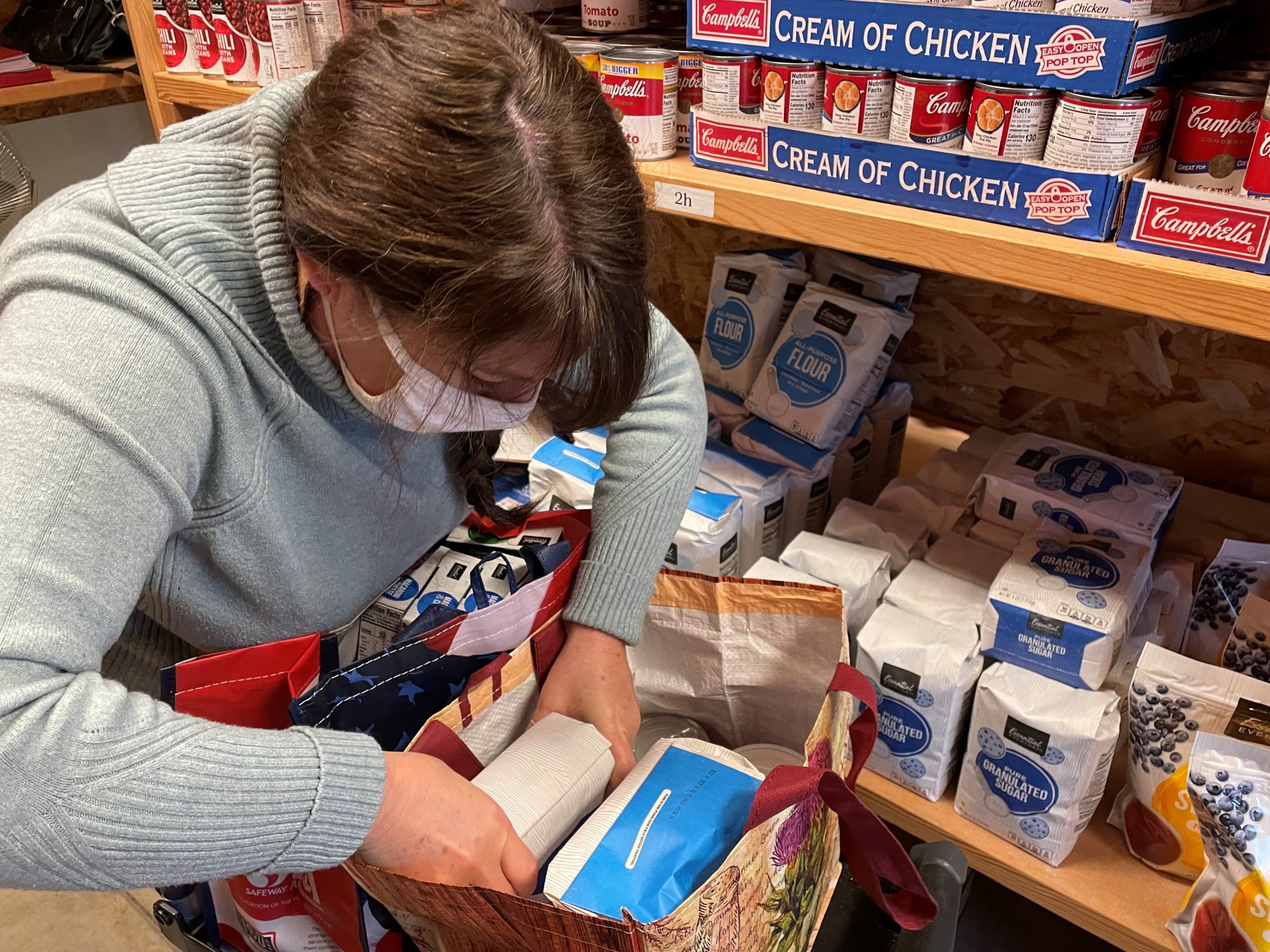 “A lot of times they don’t utilize the amount of food they can get,” adds Joy, a Transitional Case Manager in Social Services, while packing a reusable grocery bag with flour and sugar.
