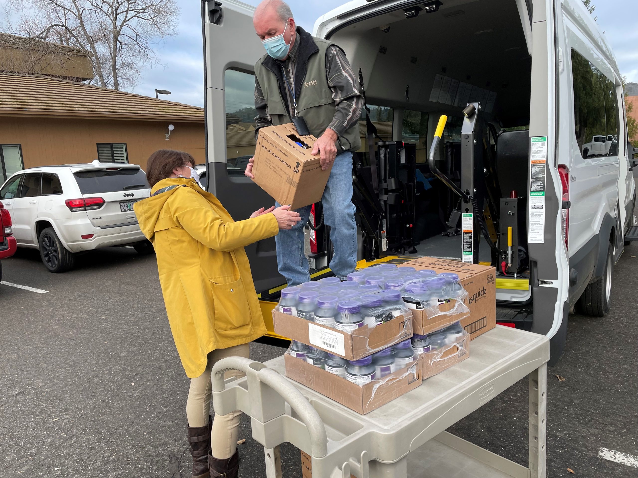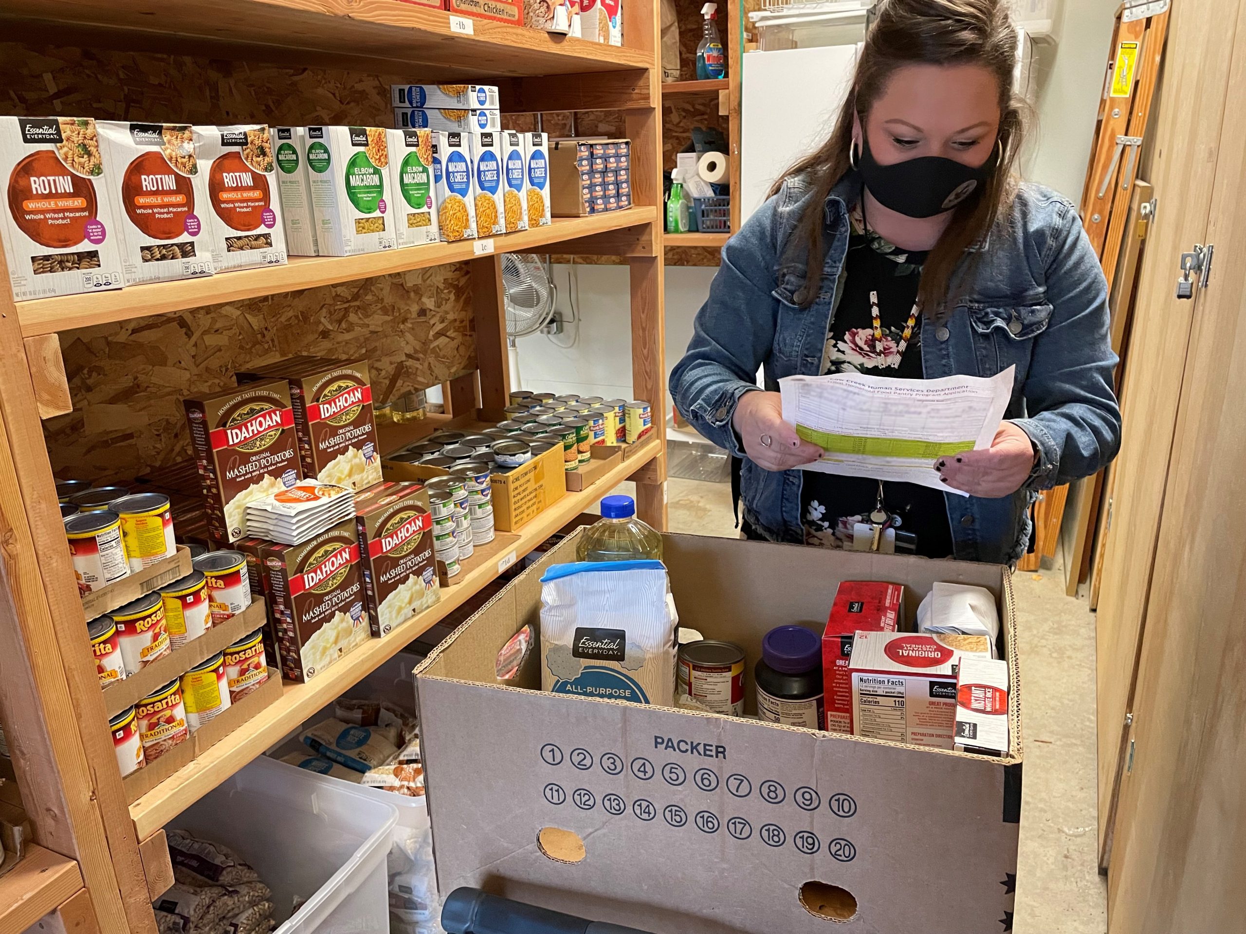 Pleasant snippets of conversation like these are heard chit-chatting back and forth on most pickup days for the Cow Creek Tribal Food Bank. Tribal members and their family catch up in the parking lot, while Sophia Gosselin and Joy Sewall stride up and down the Food Bank’s tall wooden shelves, stacked high with canned food and pantry staples, holding each Tribal member’s Food Bank shopping list. Smiles are all around. They roll up the Food Bank doors and a radio on a nearby table plays hits from the 80’s.