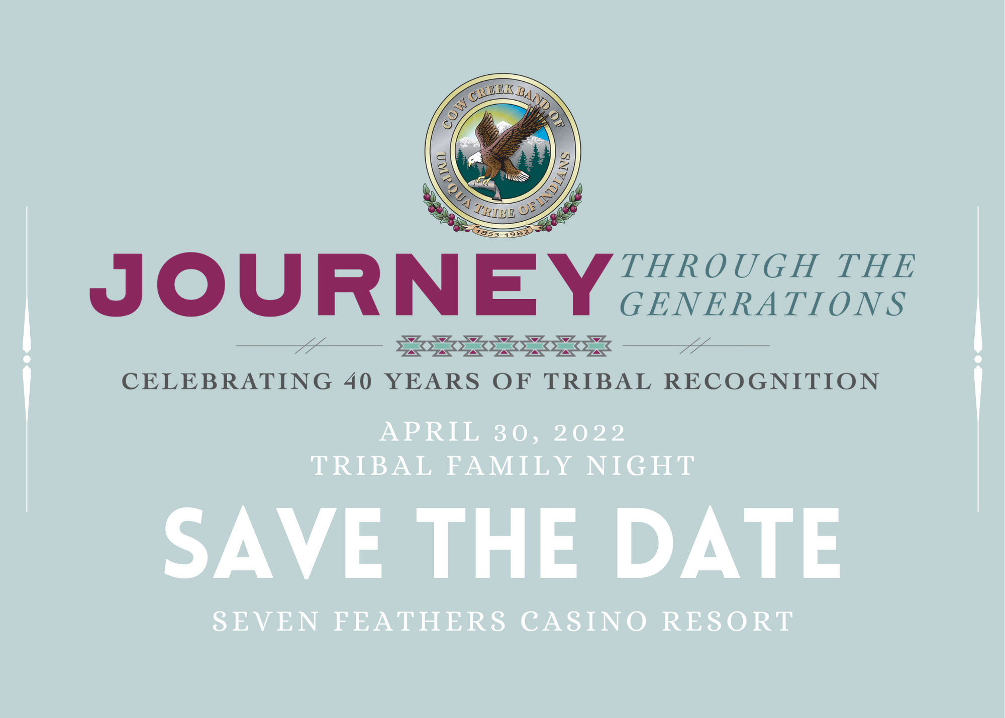 In honor of 40 years of Tribal achievements, the Tribe will commemorate the occasion with Tribal Family Night on Saturday, April 30 at Seven Feathers Casino Resort in Canyonville, Oregon.