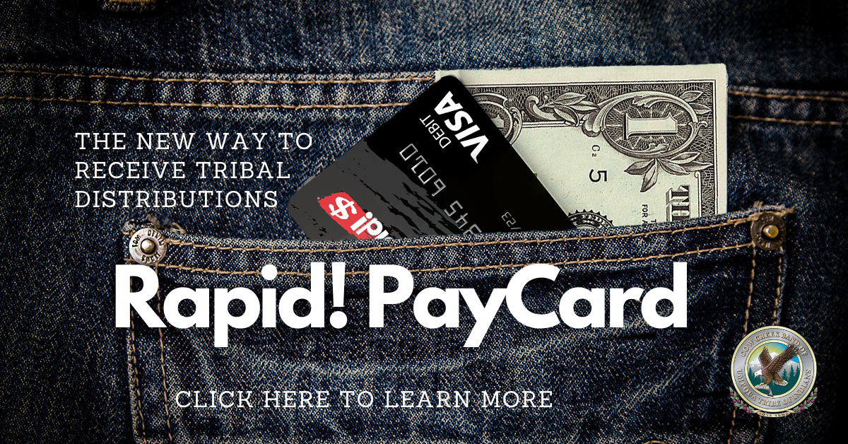Rapid Pay Cards are how all Cow Creek Tribal members receive any and all Tribal distribution payments. All Tribal members age 18-years and older, with the exception of Elders (see * below for clarification), are required to sign up for a RapidPay Card in order to receive distributions. There are no paper checks.