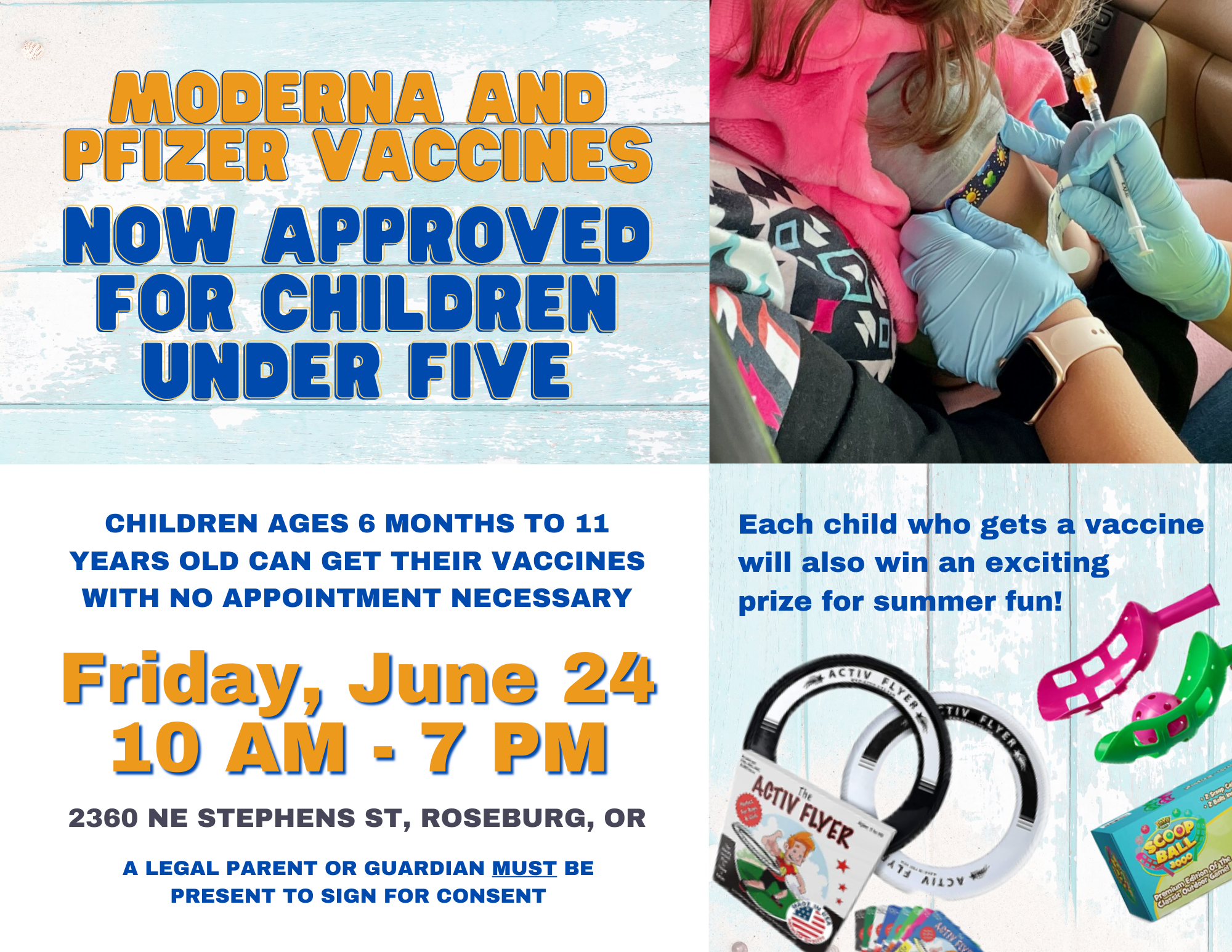 A pediatric vaccine clinic will be held on Friday, June 24 from 10AM-7PM at the mobile vaccine drive-thru site across the street from the Cow Creek Tribal Government Offices in Roseburg (2360 NE Stephens Street). Parents and guardians are invited to bring their children who are between the ages of 6 months and 11-years-old to receive their initial COVID-19 vaccine.