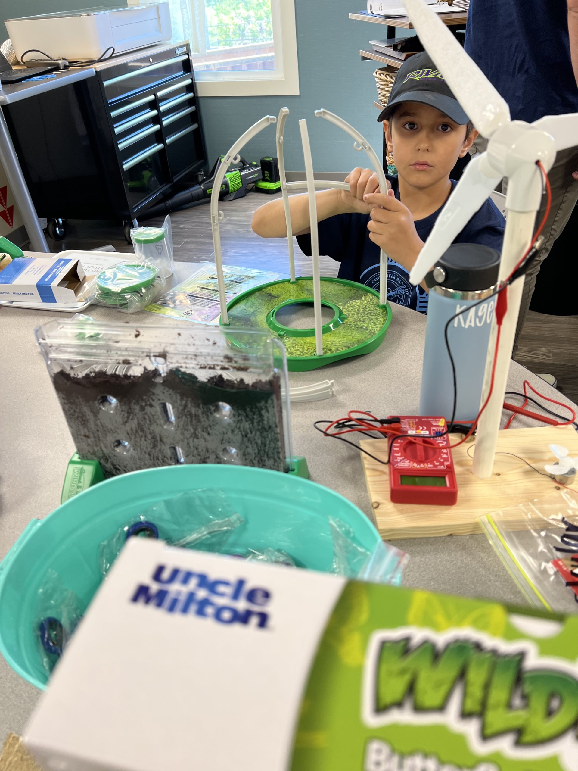 The week’s program was capped off with a full day dedicated to earth and its living creatures. Students planted bean sprouts in clear soil containers, made clean energy with wind powered fans, and pieced together a butterfly habitat that will house their live caterpillars.