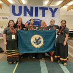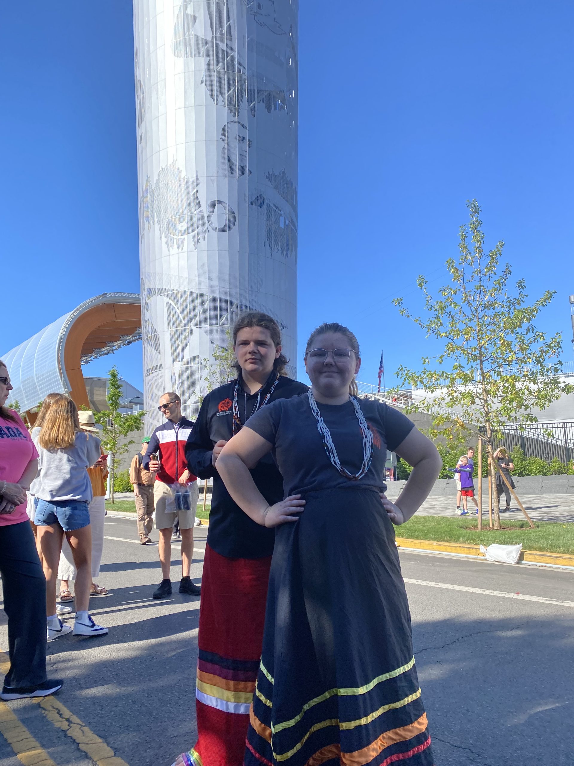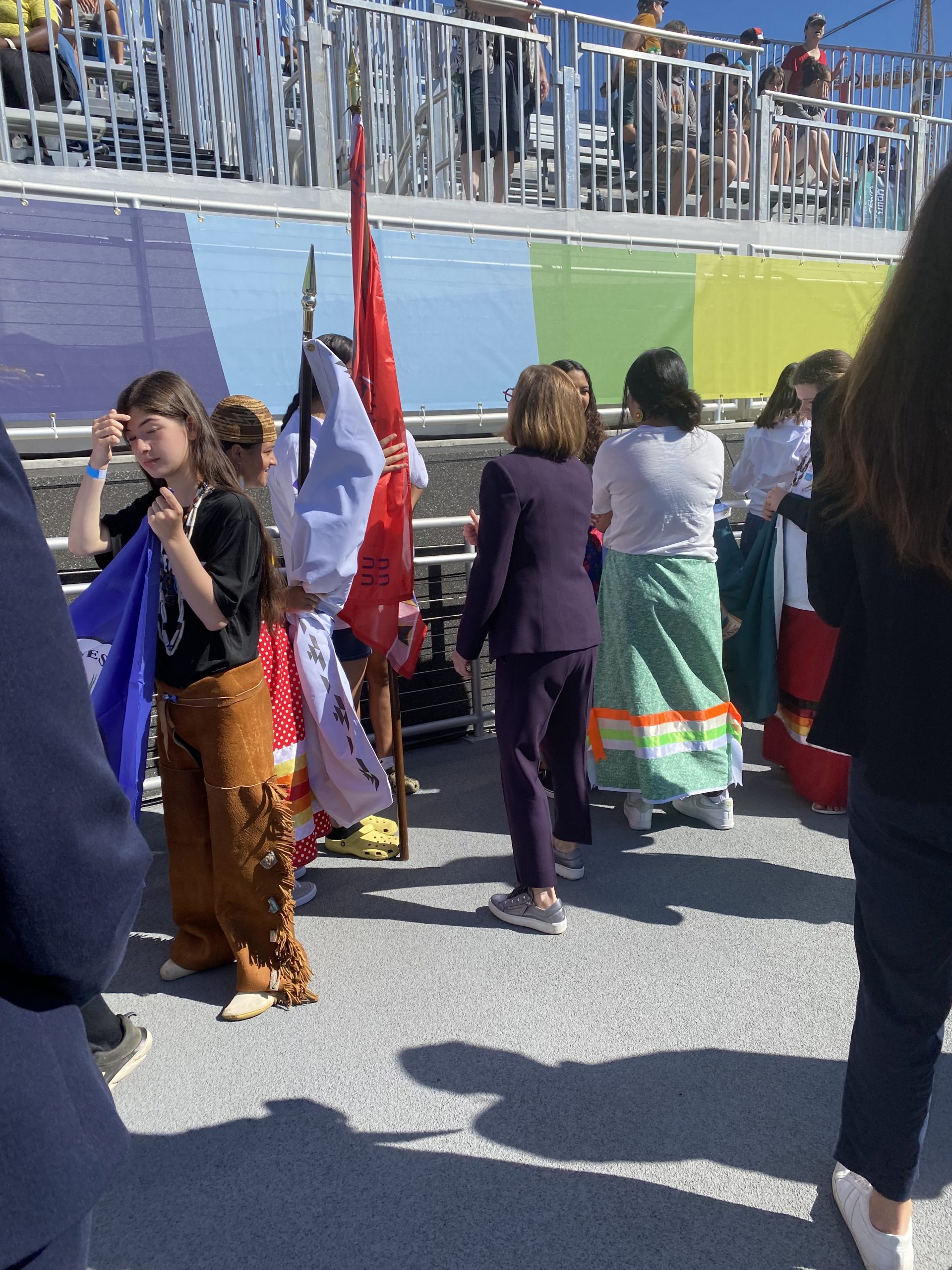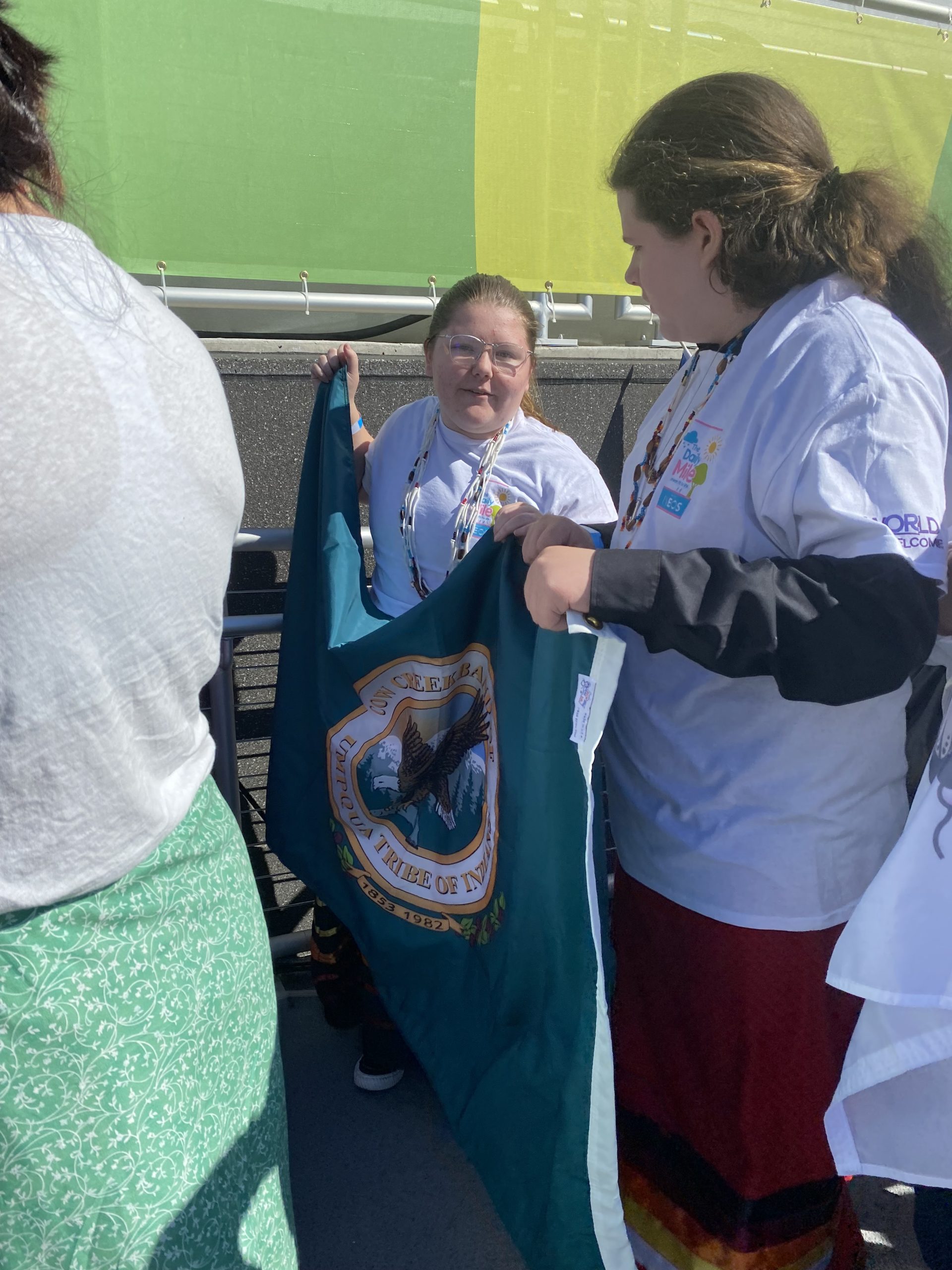 Cow Creek Tribal members Samantha Morris and Arrow Zimmerman carried the Cow Creek Band of Umpqua Tribe of Indians flag in the ceremony, as groups from all over the world paraded through the stadium to open the event.